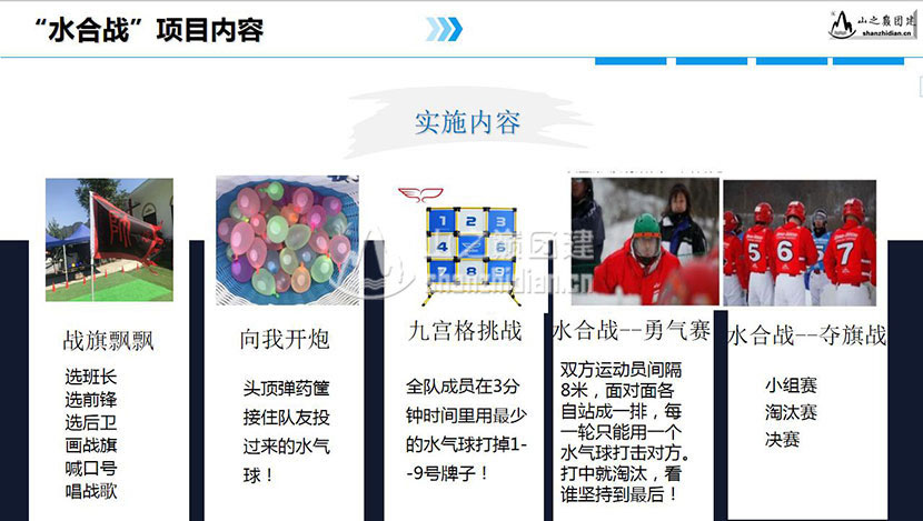 《水合战》源自国外户外运动《雪合战》,在这热情似火的季节里,来一场水气球的cs夺旗战!双方20名运动员在长36米宽10米的场地里,为了荣誉而战!这是一项集合了,战术、战略、cs、打靶、夺旗于一身的“超级打水仗”比赛。