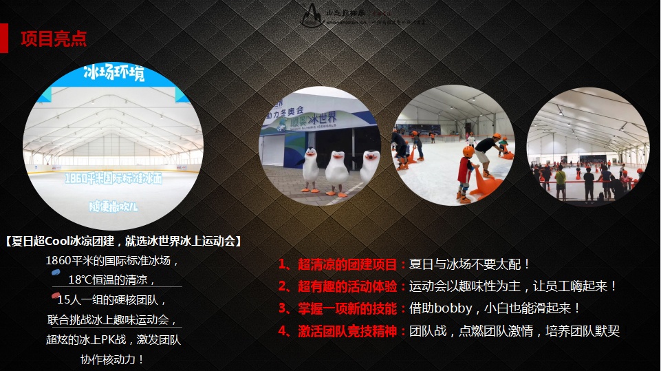 北京团建——“夏日冰爽”趣味运动会团建方案。在夏日炎炎的季节里,如何选择团建方案呢?北京山之巅团建将带您来一场“夏日冰爽”的趣味运动会团建活动。夏日与冰场简直不要太配!1860平米的国际标准冰场场地,18℃恒温的清凉感受,15人一组的硬核团队。超炫的冰上PK大战,点燃团队激情、激发团队协作核动力,培养团队默契,运动会是以趣味性为主,让员工嗨起来!夏日超Cool冰凉团建,就选“夏日冰爽”趣味运动会。