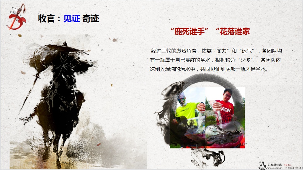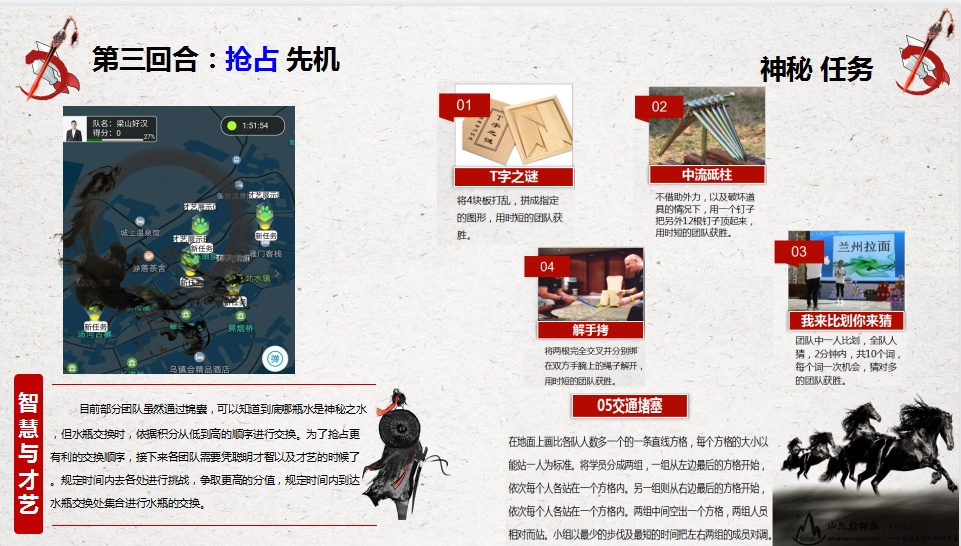 “圣水传奇”竞技主题类团建方案,在不同的项目里,不断培养团队成员面对困难时临危不惧、冷静思考的应变能力;以及在困难面前相互鼓励、支持,相互帮助,共同克服困难的勇气和决心!我们期待你的团队来挑战此次保护“圣水”的任务!