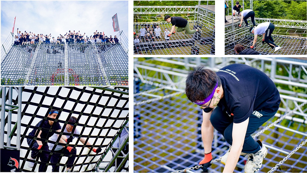 团队所有人通过1.8米的悬空攀爬并翻过网墙,需要互相帮助,不允许使用道具。参赛小组3分钟内全体全部通过此障碍,超时或未完成,每人30个波比跳惩罚。