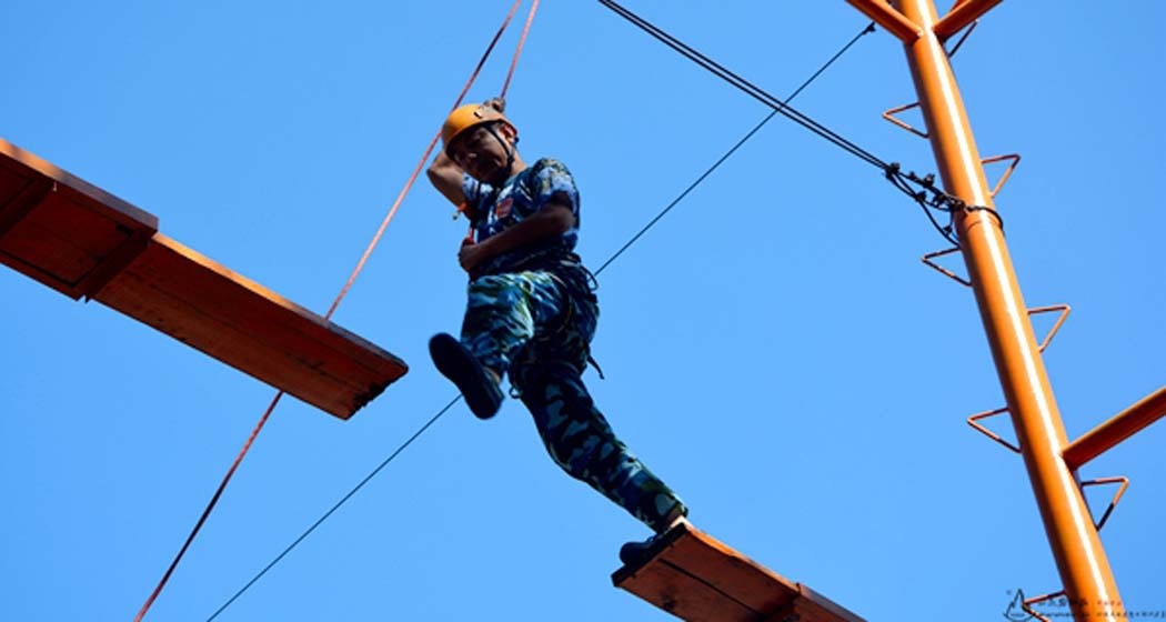 高空断桥,一般出现在军训拓展团建活动中,它是一项考验团队合作力的活动项目,成员们需要在8米的高空吊板上行走(共3块悬空的木板),即可完成挑战。在游戏过程中,不仅可以培养成员们的自信心与勇气,还可以提升团队的沟通协作力;成员们需要目标一致,相互配合、相互信任,才可以成功到达对岸,取得胜利。