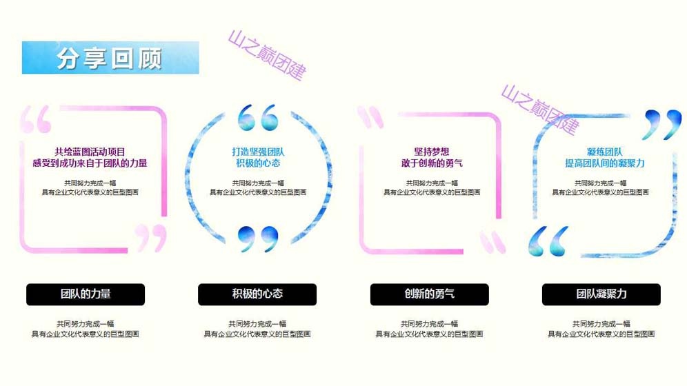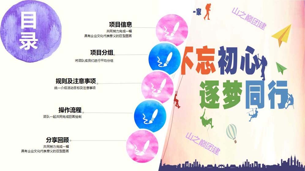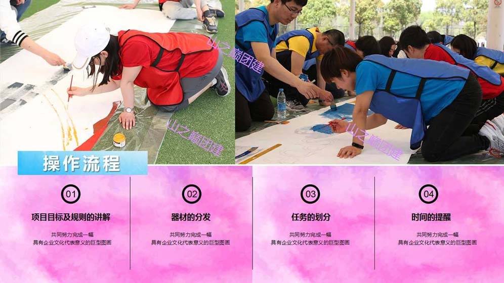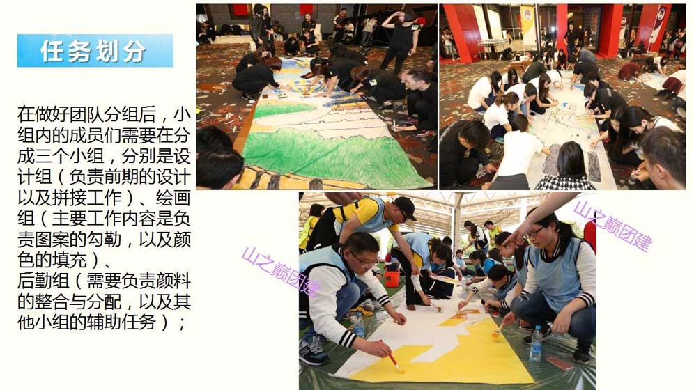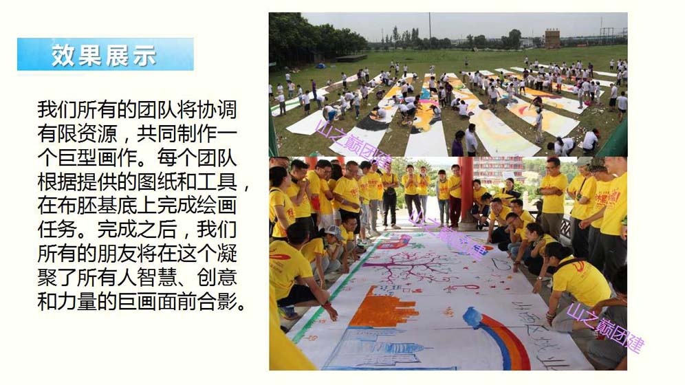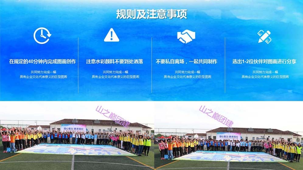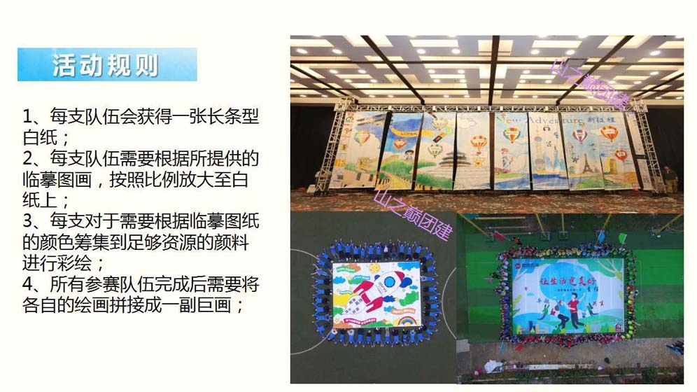 北京团建——“勠力同心,共绘蓝图”团队巨画主题团建活动。团队巨画,是一项趣味十足,非常有纪念意义的团建活动,团队中的每一位成员都可以参与到其中,适合大型团队共同合作完成。团队成员们需要共同努力完成一幅具有企业文化代表意义的巨型图画;在享受团建活动带给大家乐趣的同时,还能很好的调动团队积极性,提升团队成就感。还在等什么?赶快抓紧时间与团队小伙伴们一起勠力同心,完成一幅专属于你们的“蓝图”吧!