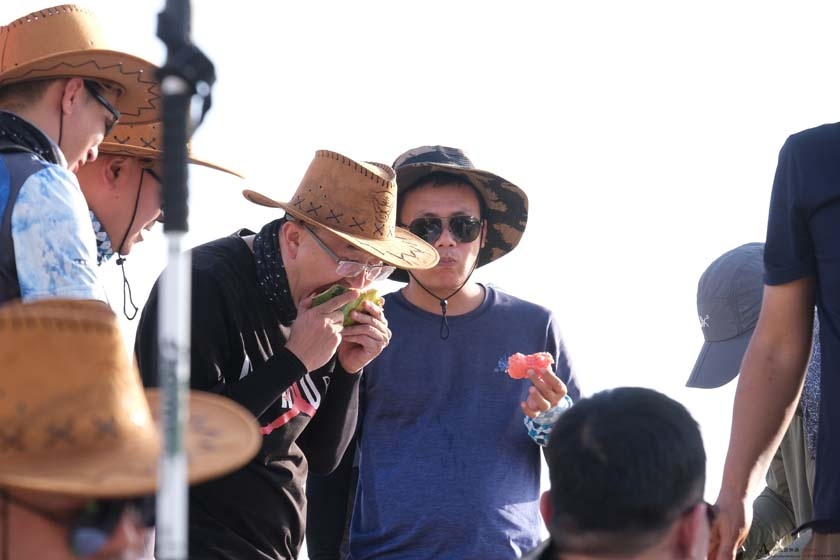 终于迎来的期待已久的库布齐沙漠徒步之旅,大家一前一后,互相扶持的一直前进着,中途还给大家休息、补充体力的时间,成员们大快朵颐的吃着汁水丰富的西瓜,补充着水分跟体力。